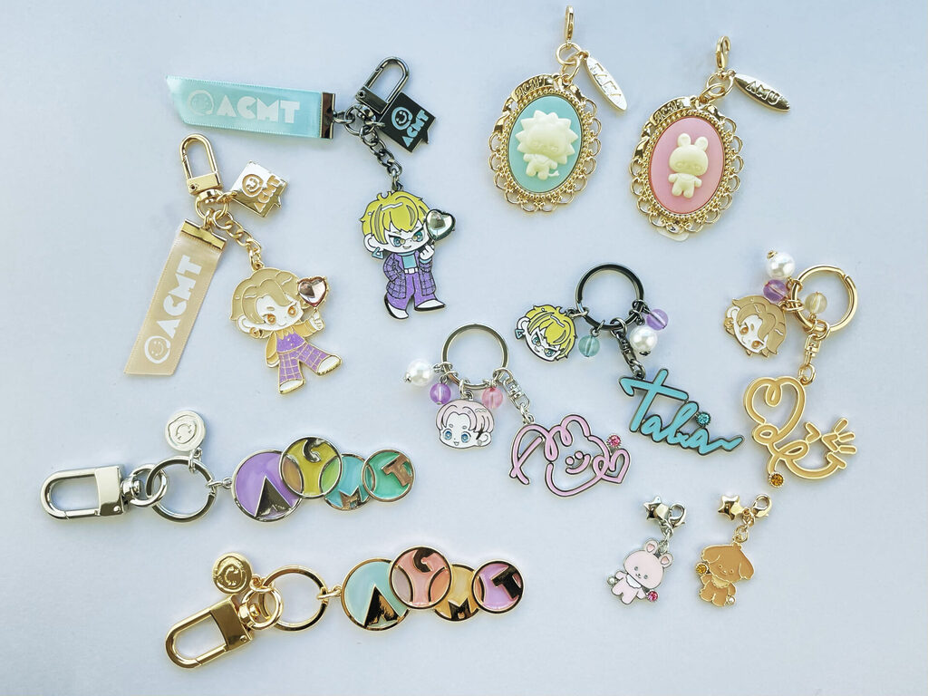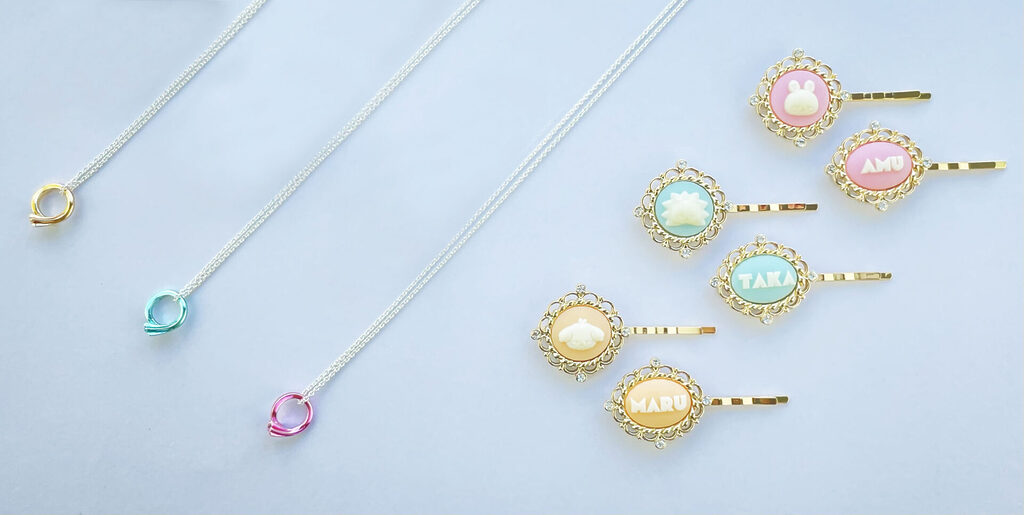 アクセサリーマルタカでは、推しのグッズを普段から気軽に身に着けられるようなデザインのアクセサリーにするのが得意です。イメージカラーはもちろん、キャラクターの衣装、持ち物、好きなもの、ロゴマーク、などからモチーフを制作していきます。大好きな推しといつでも一緒にいることを感じられるアクセサリーを作っています。