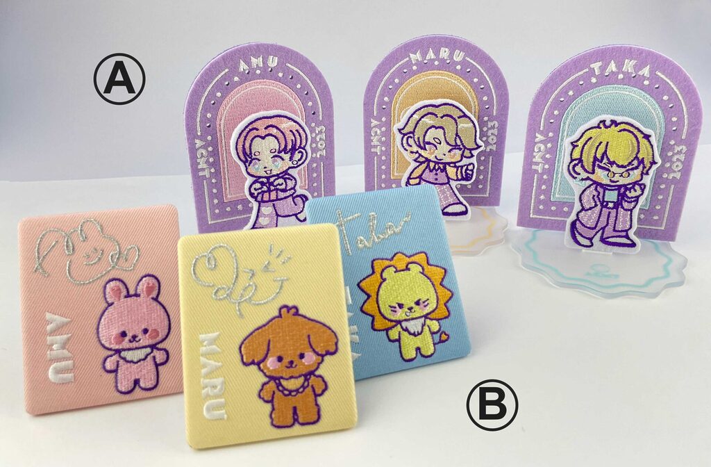 弊社デザイナーがオリジナルのアイドルグループをイラストから描き起こし、そのアイドルグループの推しグッズを作りました。