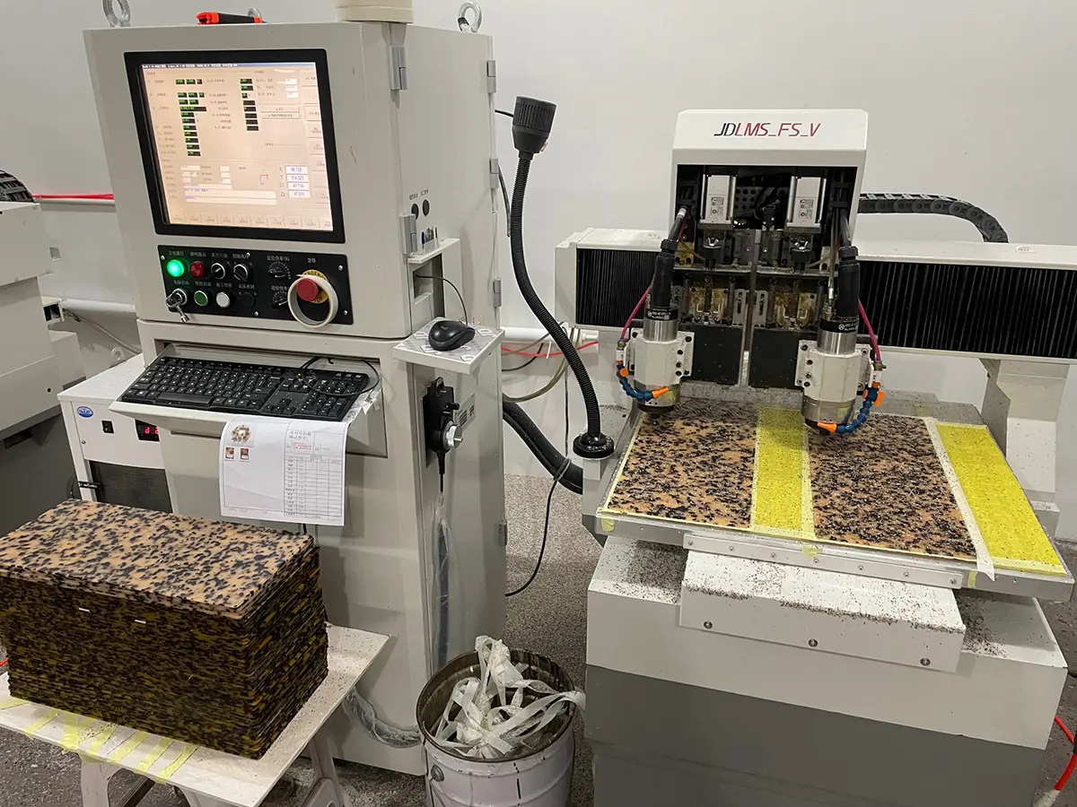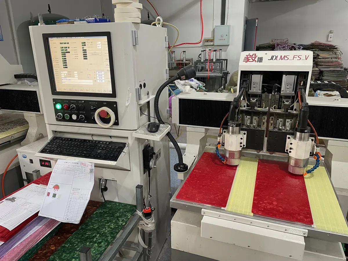 1. アセチ工場にて、仕入れた板を彫刻機でカットしていきます。