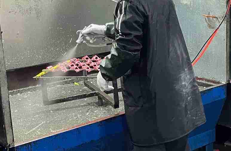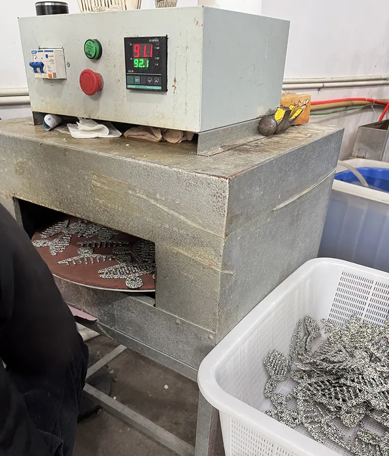 4. 成形したパーツをバレル研磨後、商品をクリア塗装コーティングし、熱窯で硬化後・石入れ作業で完成品に仕上げます。(印刷もの、エポ入れの作業によっては工程が変わります)