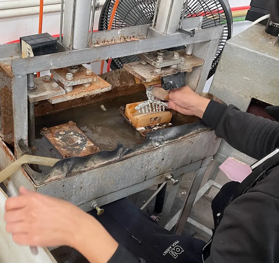3. 外したパーツを熱い釜の中で柔らかくし、型にセットしてプレス機で成形させ、水窯で冷やします。