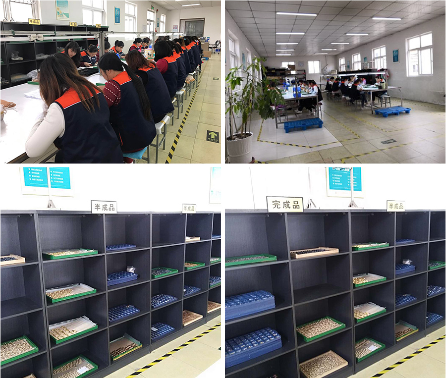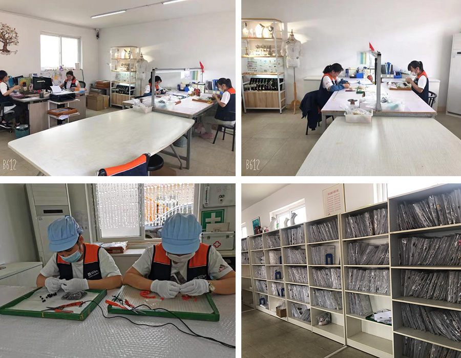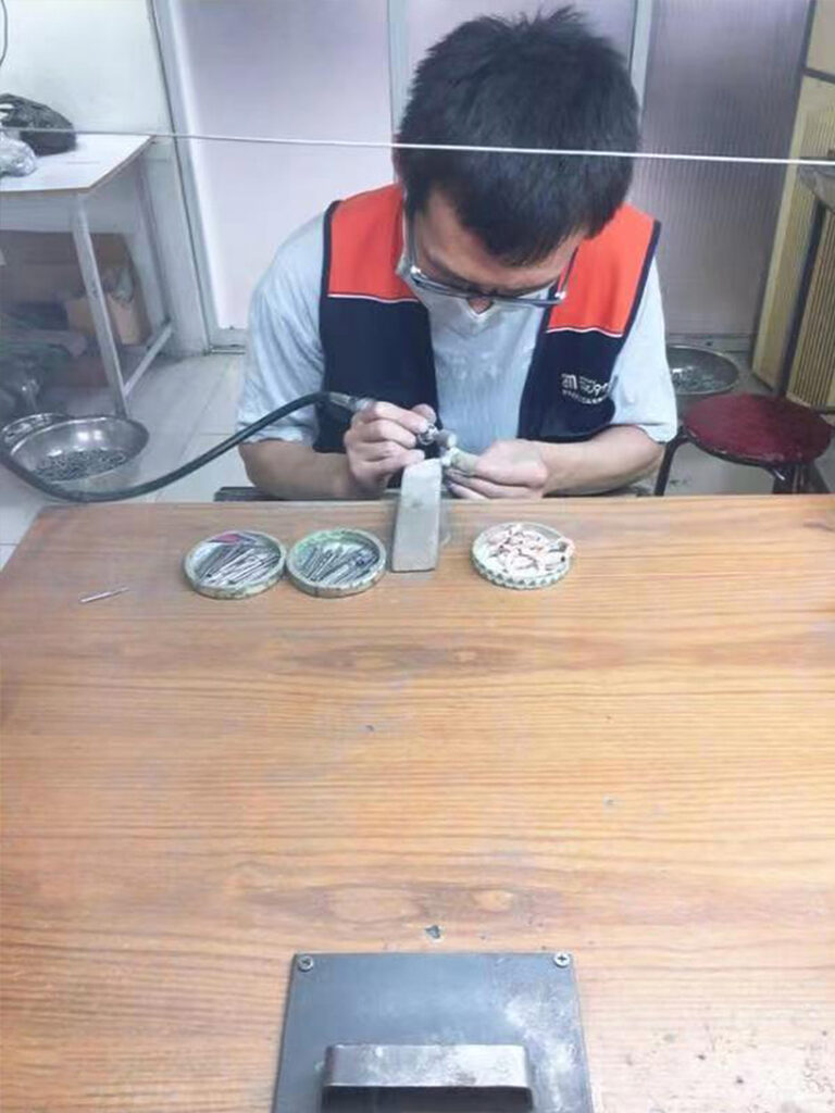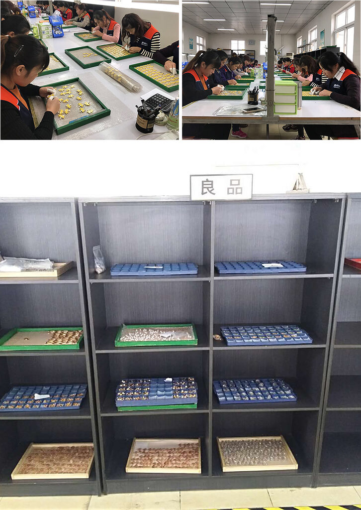 アクセサリーの生産は、昔から変わらず人の手で一つ一つ作成しております。機械加工が難しい業種ですので、一点物と言っても過言ではない、それぞれの顔があり味となるのもアクセサリーの楽しいところかと思っております。また、日本と大きく違うのは、やはり作業する人の数になります。大ロット生産には、欠かすことのできない中国スタッフとなっております。