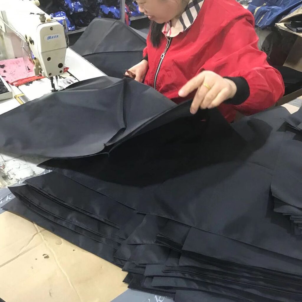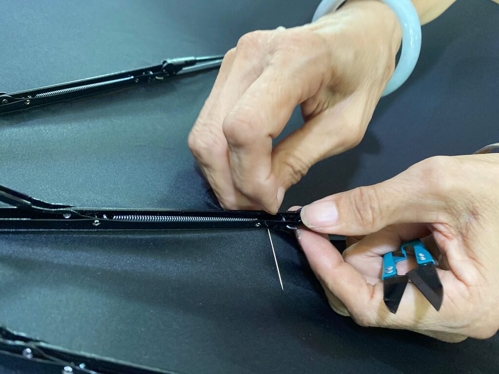上記は折畳み傘本体での工程ですが、別途袋の製作も印刷から縫製へと進行いたします。